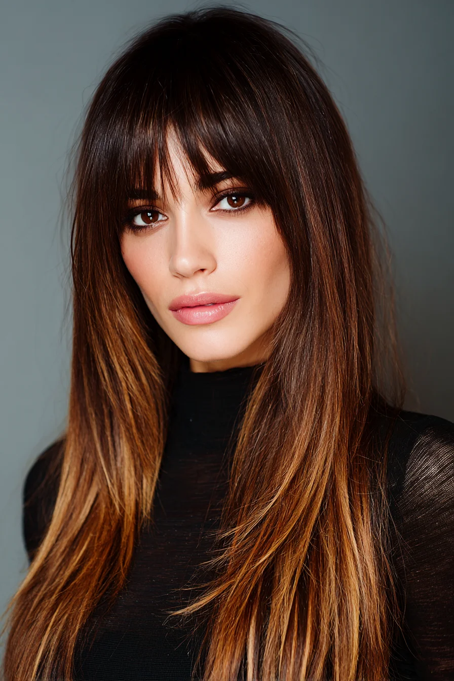 Long Sleek Hair with Blunt Fringe and Subtle Caramel Balayage