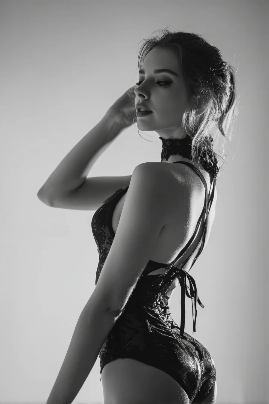 Shot in black and white, the model glances over her shoulder with a quiet, composed expression. The open-back lace bodysuit draws the eye down a long, bare spine accented by delicate ribbon ties. Loose strands of hair and soft studio light give the frame a moody, editorial feel.