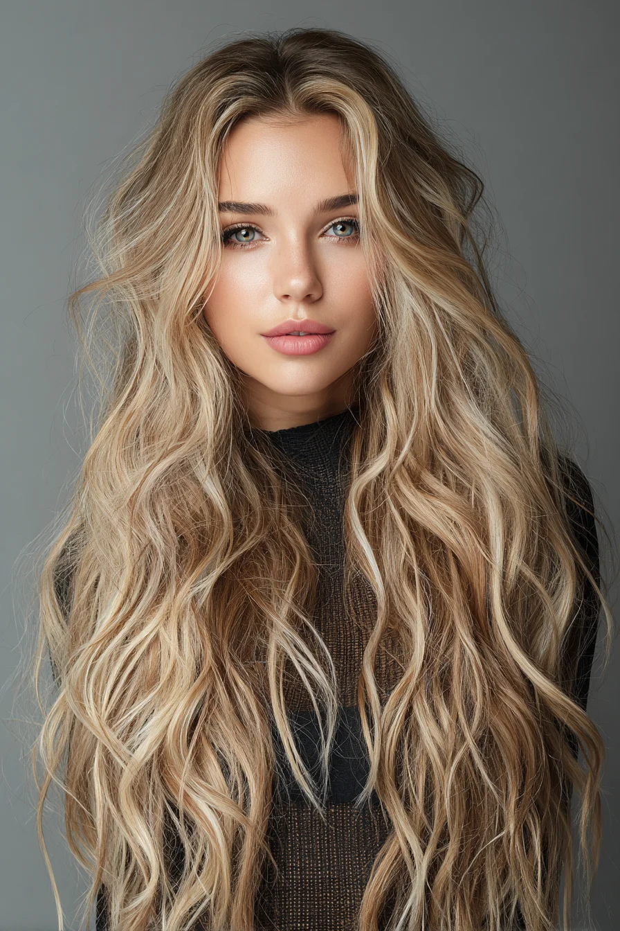 Long Beachy Waves with Face‑Framing Layers and Blonde Balayage
